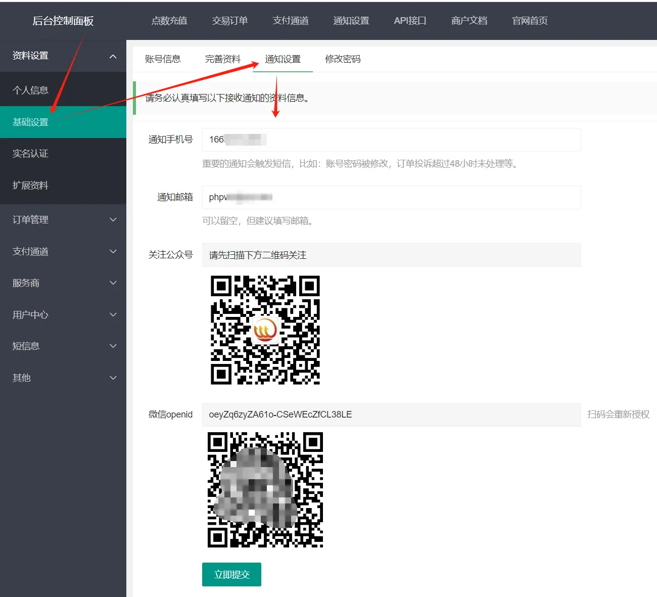点数低于商户设置的预警阈值(默认低于10元)系统会发送邮件/公众号消息通知,您点击通知内容中的链接即可快速充值,为避免点数不足导致交易失败请完善通知信息: