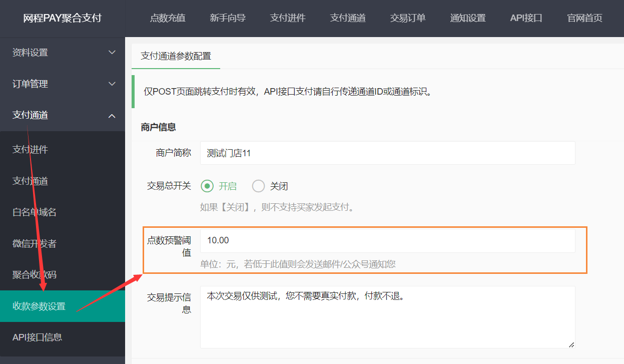 收款参数设置 - 点数预警阈值,输入预警金额(单位:元)。
