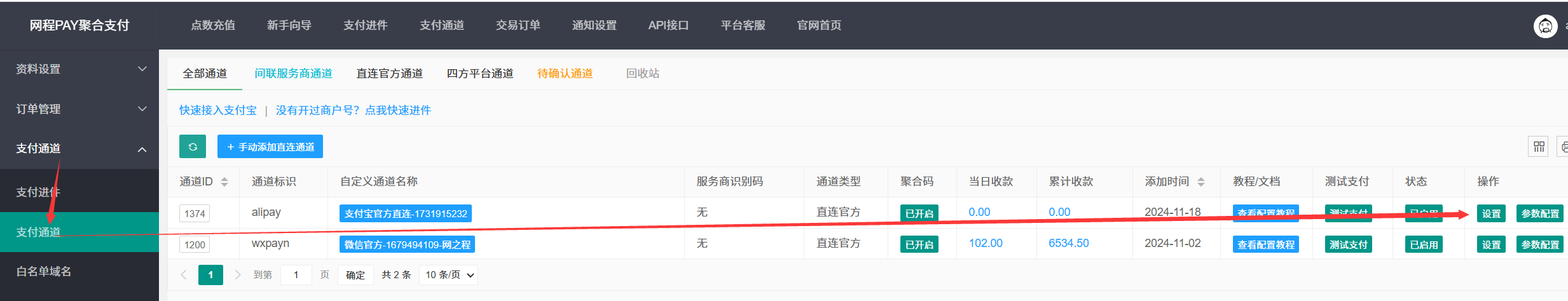 1、在支付通道列表点击【设置】