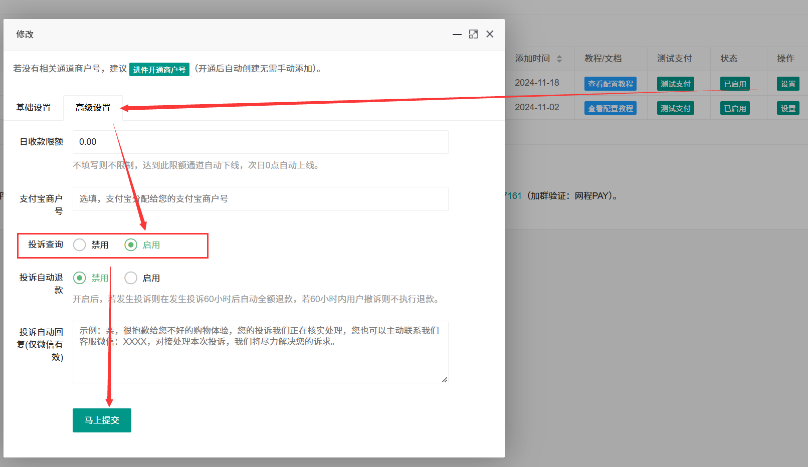 2、高级设置 - 投诉查询 - 启用