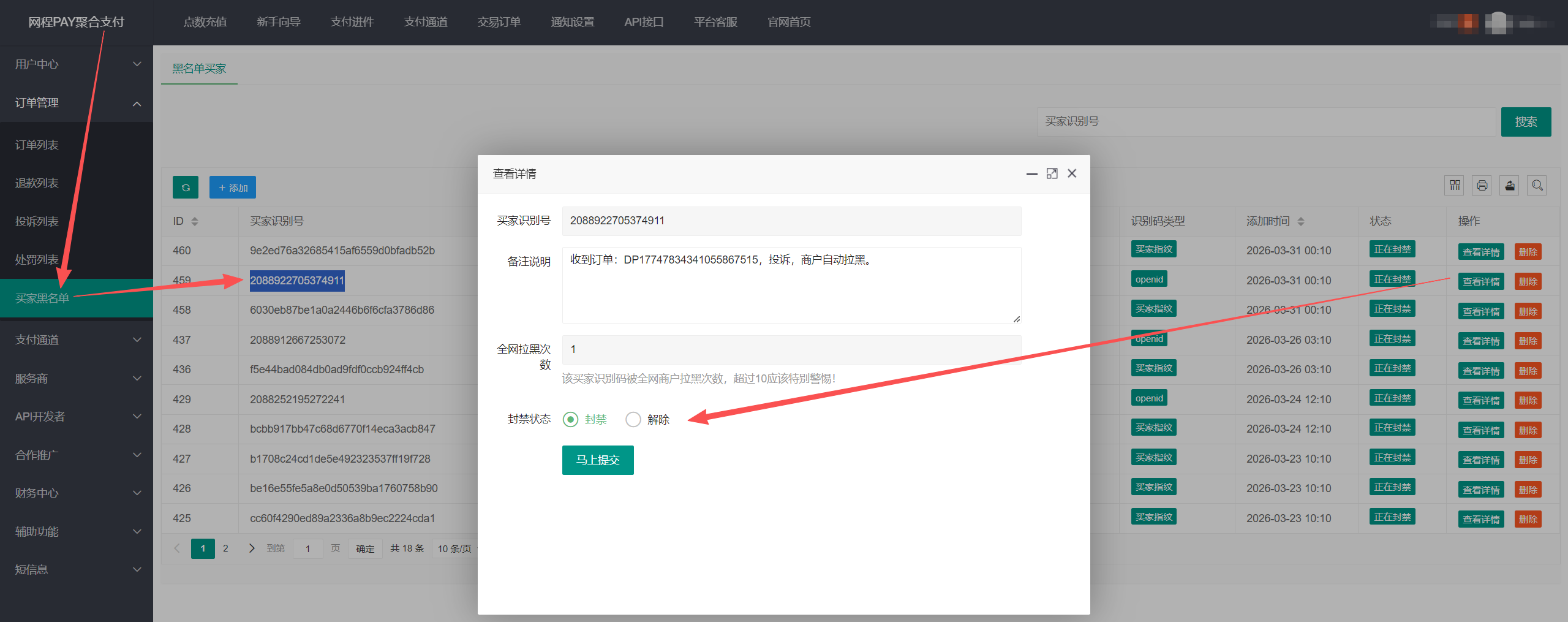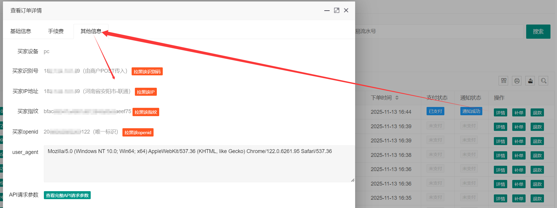 2、商户还可以在订单详情页-其他信息中手动拉黑买家指纹/买家openid (推荐两个参数都拉黑)。