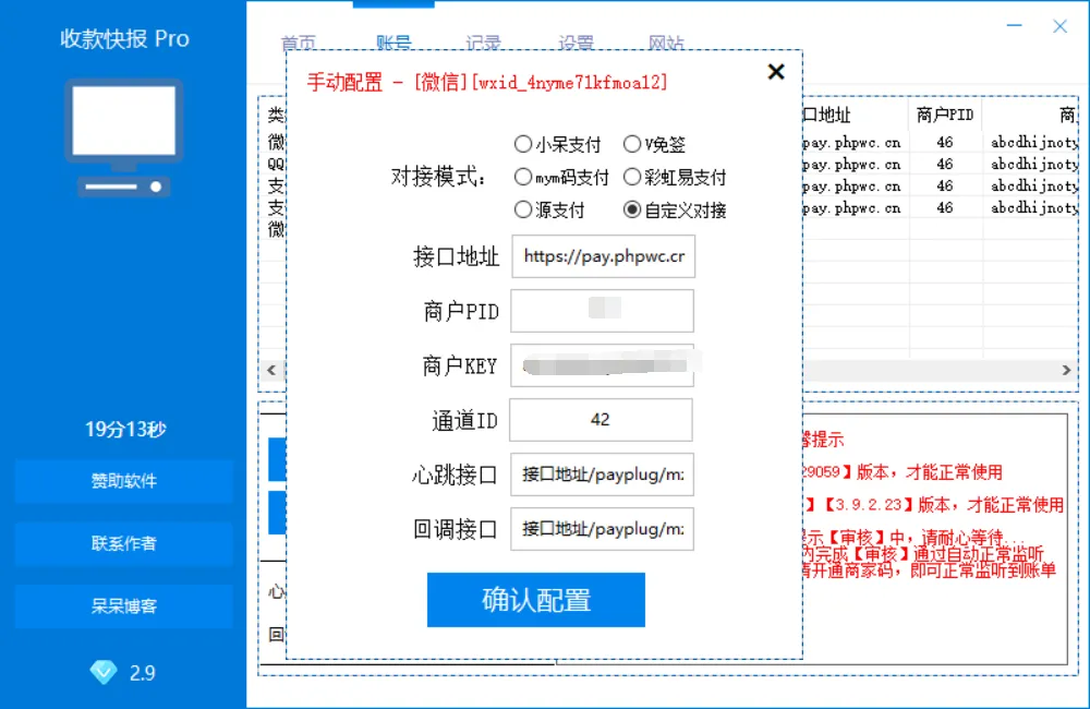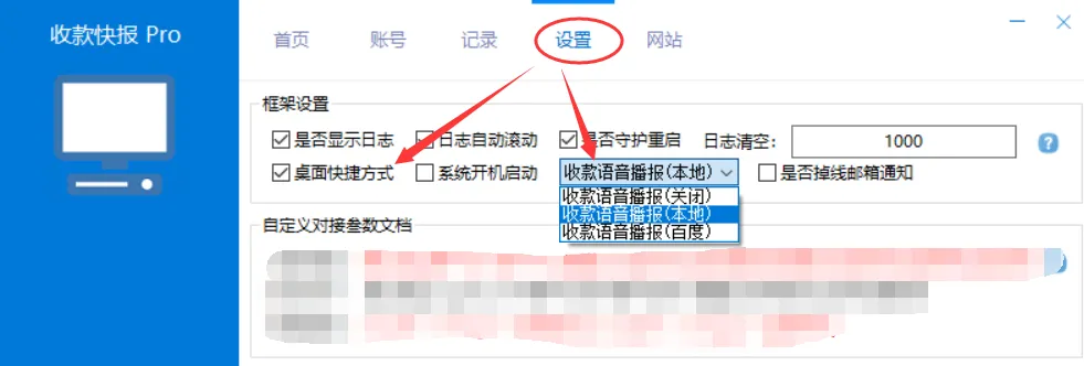 2、打开收钱快报pro找到登陆的账号 - 右键 - 手动配置 - 自定义对接,键入上述记事本中的参数。