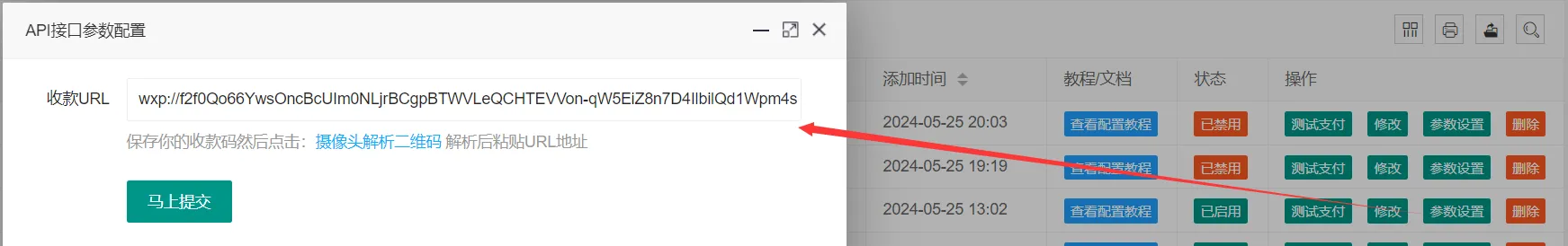 3、配置参数,按照提示解析自己的收款码,把解析到的URL粘贴到收款URL,然后提交即可。