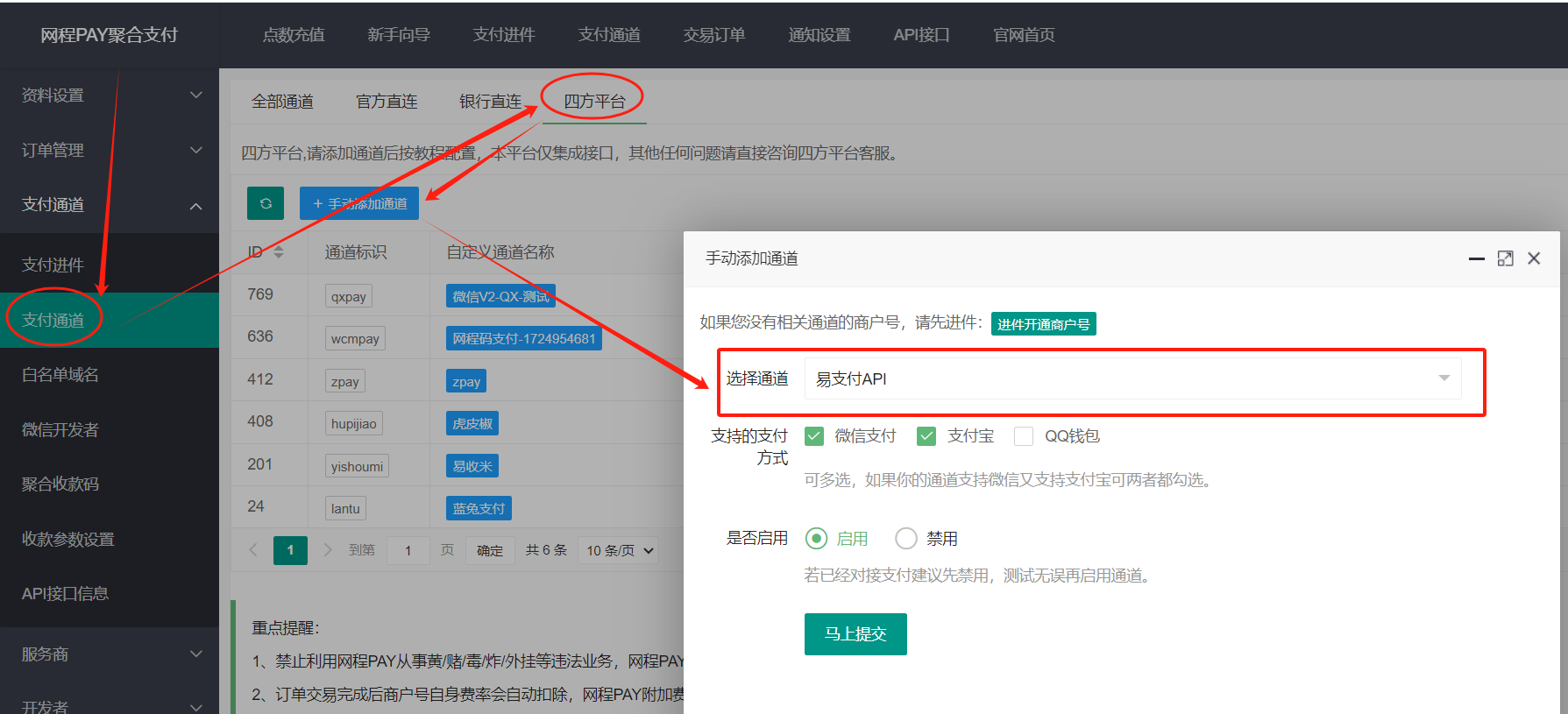 1、网程PAY-支付通道-四方平台-添加通道-选择通道:易支付API