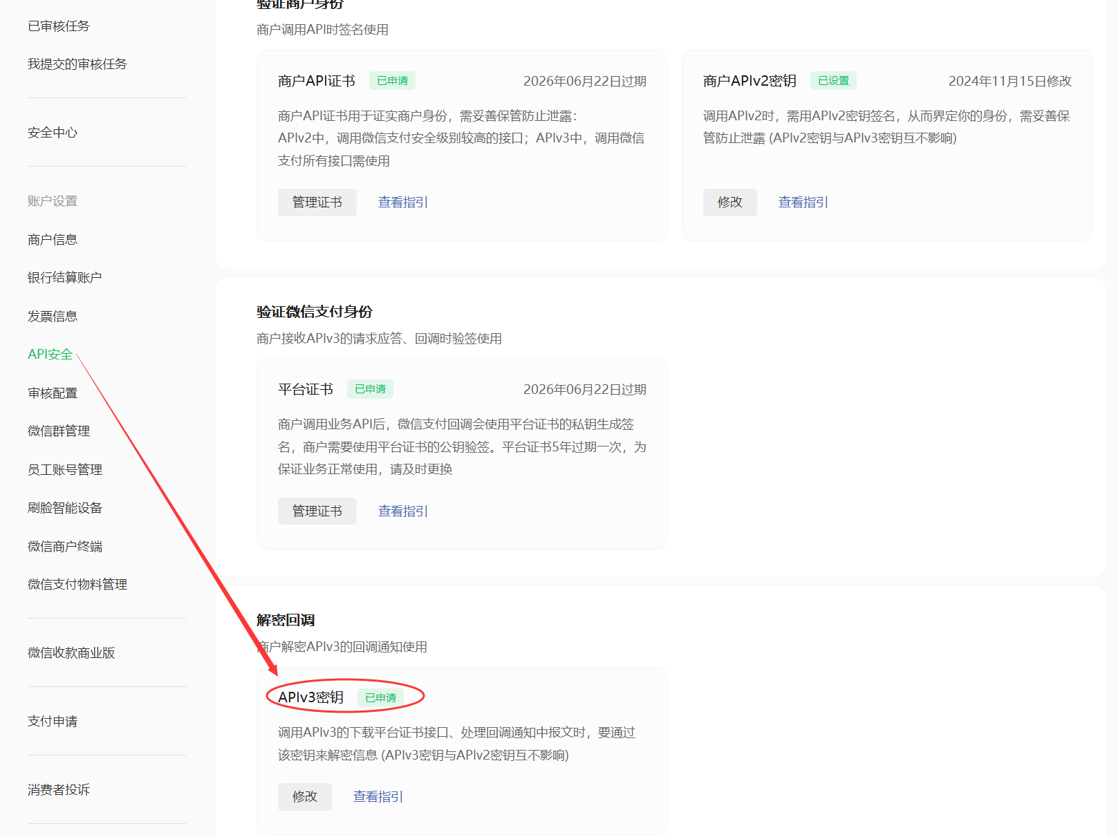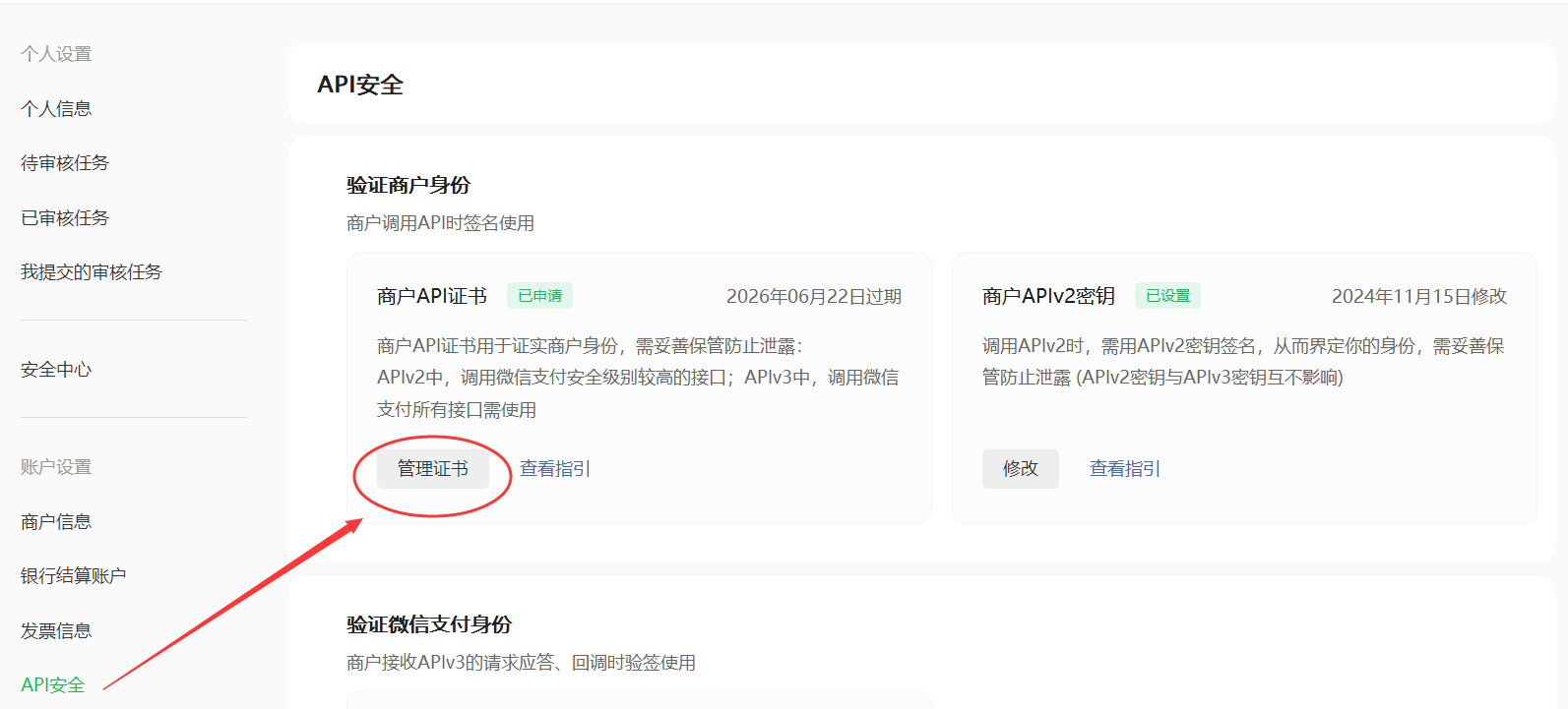 3、微信商户平台 - 账户中心 - API安全 - 申请API证书。