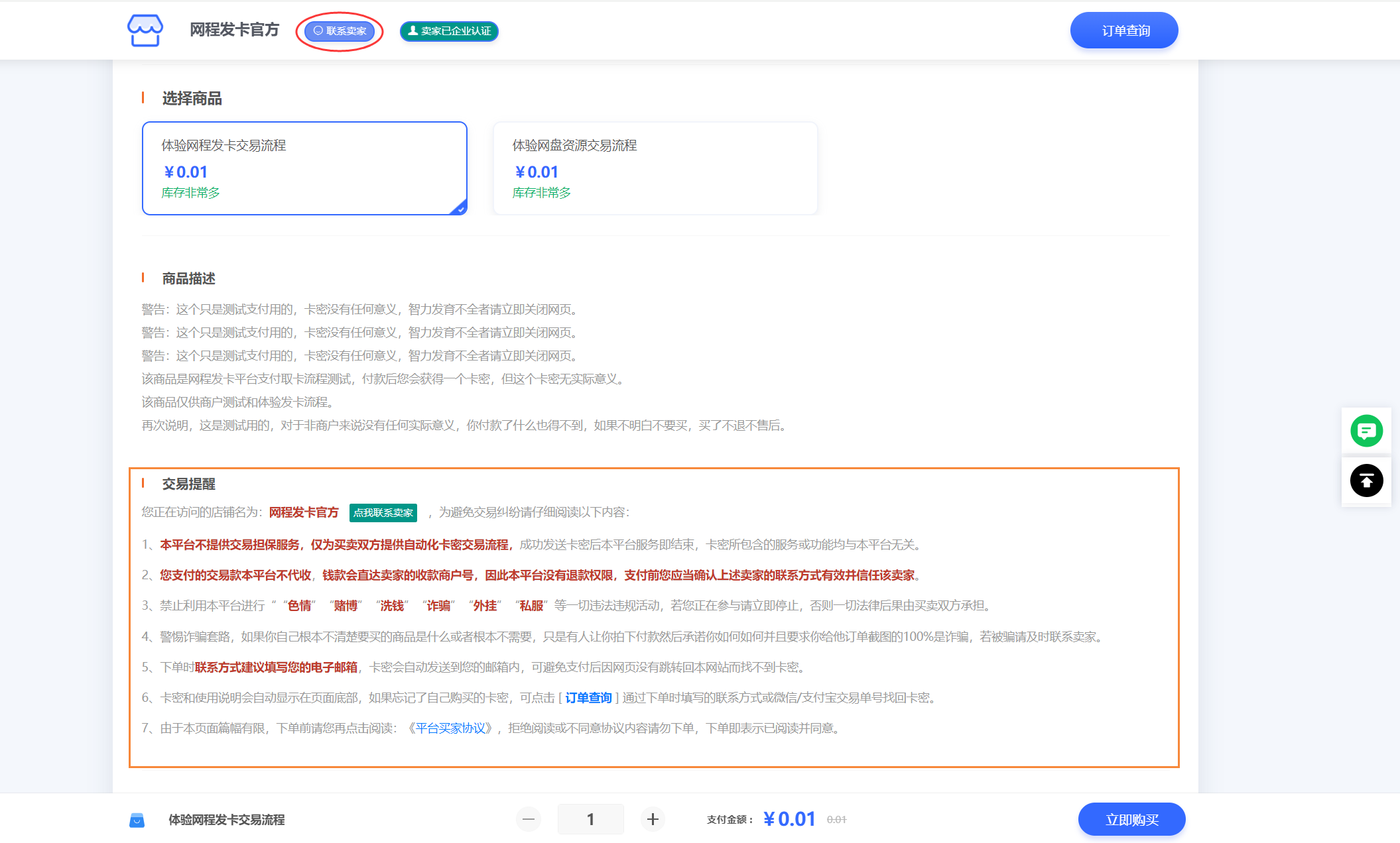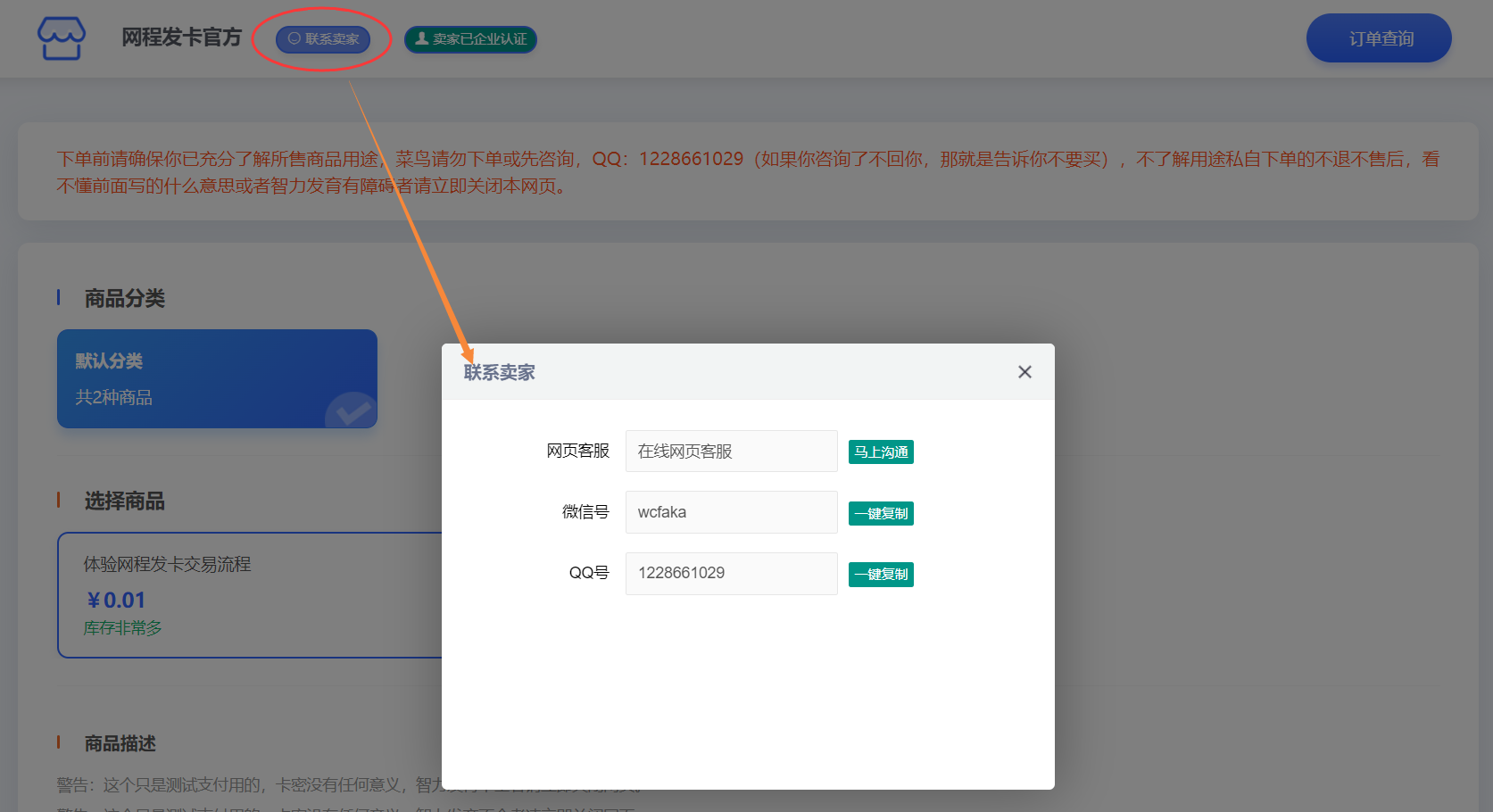 6、商户商品页面/下单页面必须在醒目位置展示卖家联系方式: