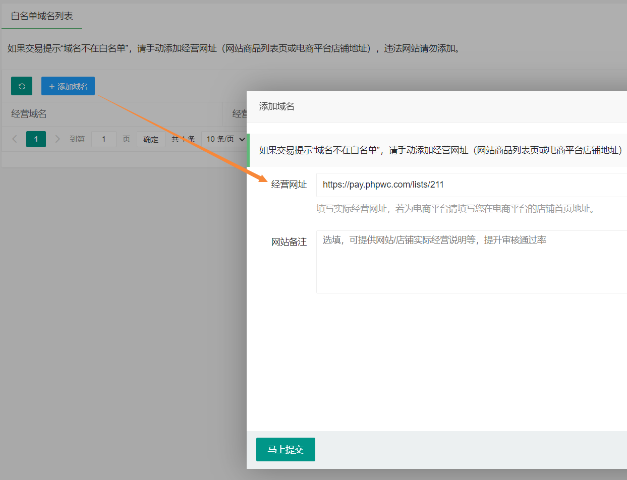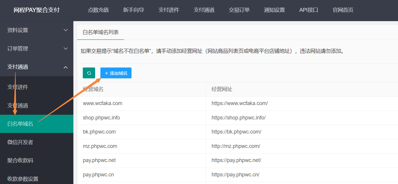 1、商户后台 - 支付通道 - 白名单域名 - 添加域名